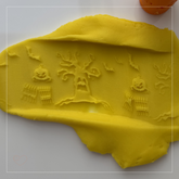 Einfach über ausgerollte Knete rollen – schon erscheinen detailreiche Muster mit Kürbissen, Geistern, Bäumen und Fledermäusen. Perfekt für fantasievolles Spielen rund um Halloween!