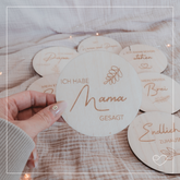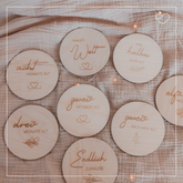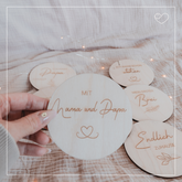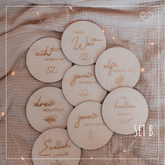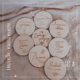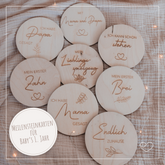 Unsere fein gravierten Holzscheiben begleiten euch von den ersten Tagen bis zu den wichtigsten Entwicklungsschritten – perfekt für Erinnerungsfotos, Alben oder als besonderes Geschenk zur Geburt.