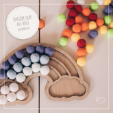Dieses liebevoll gestaltete Holz-Tray in Regenbogenform lädt Kinder zum kreativen Spielen, Füllen und Sortieren ein. Ob mit buntem Reis, Perlen oder Naturmaterialien – es entstehen immer wieder neue sensorische Erlebnisse.