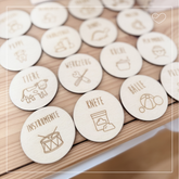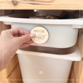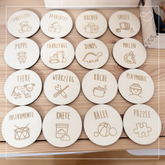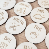 Die runden Labels bestehen aus stabilem Holz (Ă 6 cm, 4 mm dick) und lassen sich mit den mitgelieferten Klett-Klebepunkten kinderleicht befestigen.